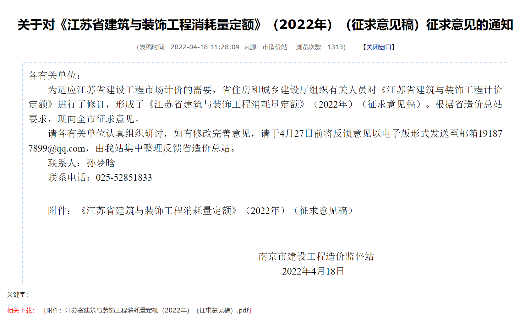 轉(zhuǎn)發(fā)關于對《江蘇省建筑與裝飾工程消耗量定額》(2022年) (征求意見稿) 征求意見的通知,其下載連接如下所示: