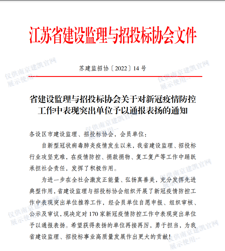 恭喜我司榮獲省建設(shè)監(jiān)理與招投標(biāo)協(xié)會(huì)授予《新冠疫情防控工作中表現(xiàn)突出單位的通報(bào)表?yè)P(yáng)》