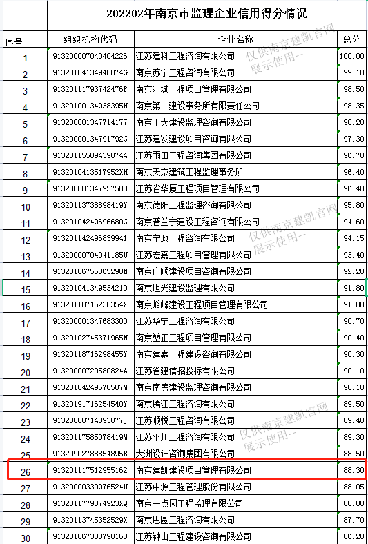 我司監(jiān)理企業(yè)在2022年下半年南京市建設(shè)工程監(jiān)理企業(yè)信用評(píng)價(jià)綜合得分88.30分