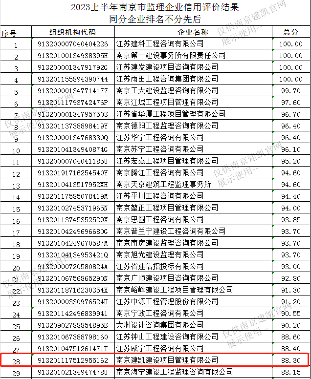 我司監(jiān)理企業(yè)在2023年上半年南京市建設(shè)工程監(jiān)理企業(yè)信用評價綜合得分88.30分