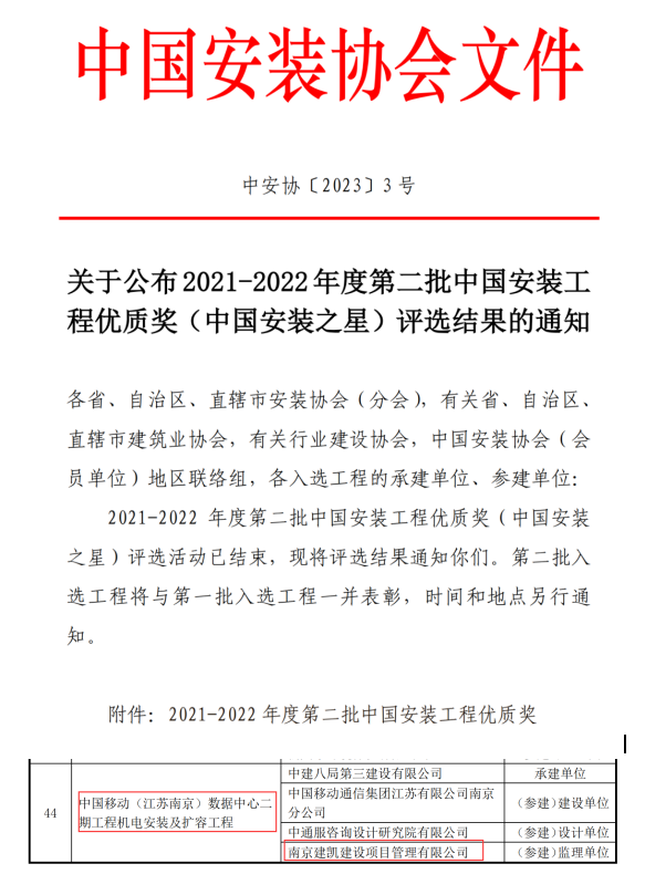 中國移動(江蘇南京)數(shù)據(jù)中心二期工程機電安裝及擴容工程榮獲“中國安裝工程優(yōu)質(zhì)獎(中國安裝之星)”獎