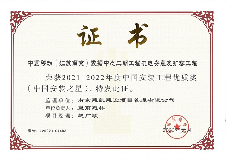 中國移動(江蘇南京)數(shù)據中心二期工程機電安裝及擴容工程榮獲“中國安裝工程優(yōu)質獎(中國安裝之星)”獎
