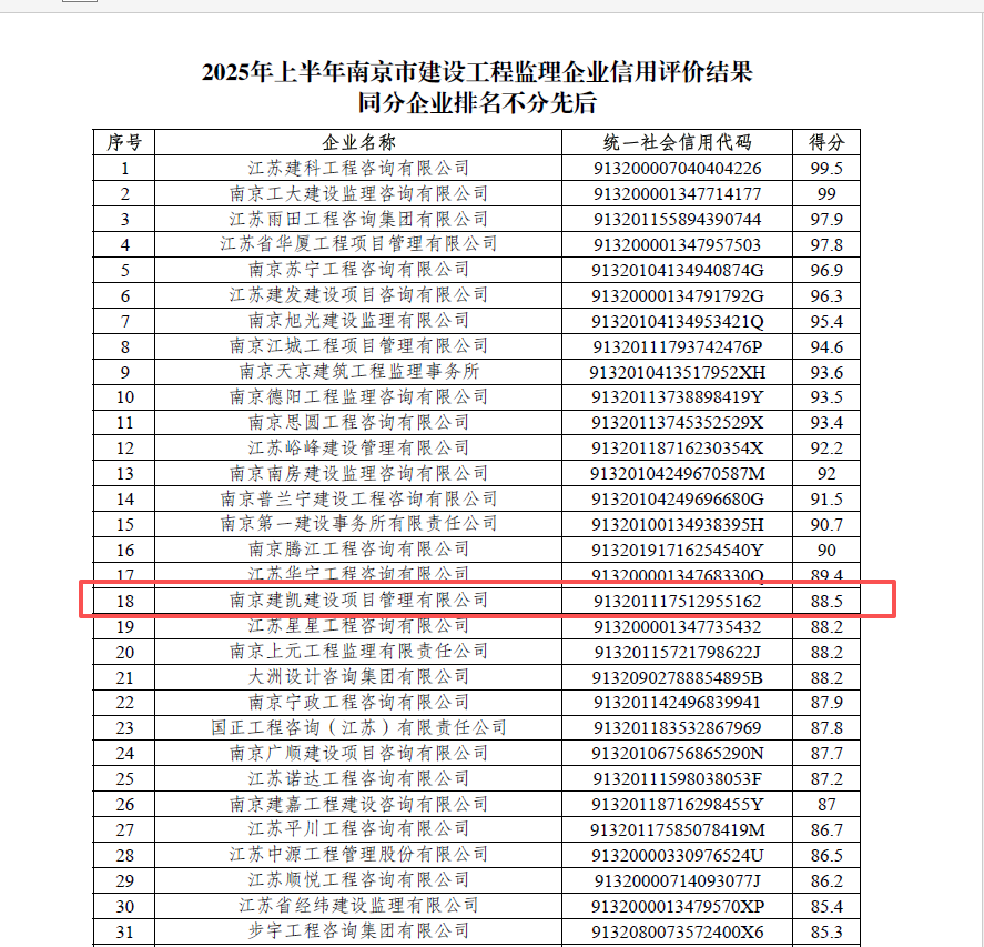 2025年上半年南京市建設工程監(jiān)理企業(yè)信用評價結果