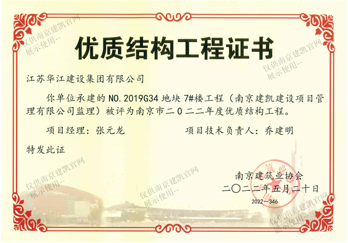 南京市二0二二年度優(yōu)質(zhì)結(jié)構(gòu)工程(NO.2019G34地塊7#樓工程)